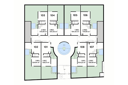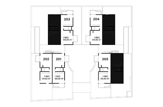 En este piso se ubica el segundo nivel de los modelos a doble altura de planta baja, además de otros cuatro departamentos con balcón y de una recámara cada uno.